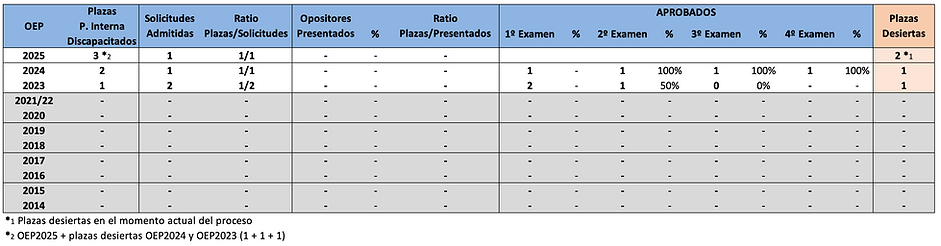 En este apartado os resumimos el número de presentados y aprobados de cada examen y en cada proceso selectivo de las Ofertas de Empleo Público de 2014 a 2025.